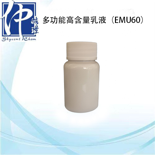 产品简Skysoft® EMU-60 是一种多功能高含量的特种改性有机硅乳液,产品含有特殊活性 基团,成膜性较好,由于产品是非离子乳液,所以复配性优异,适用于各行业中; 纺织行业作为起毛剂及缝纫线润滑剂使用,皮革行业中经处理后具有优异光亮、 丝滑的手感,在家具及汽车护理中能有效使用表面光洁如新、滑爽效果;同时也 广泛可作为脱模剂使用。产品特性非离子乳液,复配性好;乳液的特殊粒径提供高光泽度;乳液粒径分布均匀,稳定性相对较好;无黄变,可用于处理白色、浅色织物;应用方便,可直接使用,或经简单稀释后使用;不含烷基酚类物质,更环保;可广泛用于纺织、皮革、日化等行业;物理特性外 观 乳白色液体粘度(25℃) 1000 ~2000 cps离 子 性 非离子固 含 量 62~65%p H 值 6.0 ~ 8.0产品应用Skysoft® EMU-60多功能高含量乳液的成膜性好,乳液粘度适中,稀释方便且 稀释液相对比较稳定,在纺织、皮革、日化等方面均有广泛应用。纺织工业中,可作为润滑剂、平滑剂、光亮剂、流平剂及抗粘剂使用。在 纱线的加工与整理可起到润滑及平滑添加剂,与其它助剂一起用于纤维及织物的 柔软整理;也用于在深色织物的特殊光亮效果处理;在印花工序中,也可作为流 平剂或抗粘剂使用,以提高浆料的流平性,减少堵网现象,并改善手感;皮革工作中,具有光亮、丝滑功能,与其它助剂一起用于涂饰工序,改善 皮革的光亮度及手感;日化行业中,可作为柔顺剂、光亮剂,与其它助剂复配应用注意事项1. Skysoft® EMU-60属于多功能高含量乳液,产品在贮存过程中可能会出现 轻微分层现象,属于正常。2. Skysoft® EMU-60属于特殊结构的有机硅光亮剂,若与氨基硅油乳液或非 硅类柔软剂配合使用,在光亮度、平滑性、柔软性方面的综合效果更佳。3. 为了达到最佳的整理效果,建议使用前适当搅拌使其均匀;4. 避免将产品、其稀释液或复配液长期直接暴露在空气中,建议尽快用完,不用时须将容器盖盖紧。操作及贮存产品在常温条件下一般可贮存十二个月,应避免将产品长期暴露在极端冷、 热的环境下,极端冷、热的环境可能导致乳液分层。如果产品出现分层现象,使 用前需要适当搅拌;为了确保产品质量,容器开封后应尽快用完,不用时须将容 器盖盖紧。