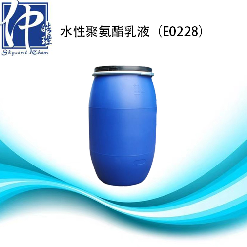 产品简介Skytech ® E0228 为特种聚氨酯的水分散液,具有成膜透明、光亮度高、手感 柔软且不粘手、耐黄变性能良好、干湿摩擦牢度高、吸水率低等特点,可用于各种 皮革制品的中涂或顶涂,特别是对光亮度、物性要求比较高的涂饰中;也可用于各 种纺织品的涂层或印花工艺中。Skytech ® E0228 能够有效提升被涂饰品的物性、外观及手感,可广泛用于皮 革、纺织、纸张、塑料等行业。产品特性成膜透明、光亮度高;手感柔软、不粘手;黄变低、耐温性能好;与基材粘结力强,干、湿摩擦牢度高;配伍性好,可单独使用,也可与其它阴、非离子树脂复配使用;产品单独使用时物理性能更优异;产品稳定,使用方便;物理特性外 观 微蓝光半透明乳状液体固 含 量 34 ± 2%粘 度 ( 2 5 ℃ ) 10 ~ 300mpa.sp H 值 6.0~8.0离 子 特 性 阴离子成 膜 特 点 中等软度(S)产品应用Skytech ® E0228 可广泛用于皮革、纺织、纸张、塑料等行业。实际应用时可 根据生产设备条件选择喷涂、喷淋、刮涂或辊涂的生产工艺;并根据整理效果的要 求,灵活选择助剂的使用量。应用注意事项1、Skytech ® E0228 属阴离子体系,使用时应避免与酸或阳离子体系拼混;2、Skytech ® E0228 为成膜树脂,应避免将产品本身、稀释液或复配液长期 直接暴露在空气中。操作及贮存常温条件下,产品有效贮存十二个月,应避免将产品长期暴露在极端冷(5℃以 下),热(45℃以上)的环境中,为确保产品质量,容器开封后应尽快用完,不用时 须将容器盖紧。