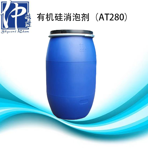 产品简介Skysoft® AT280 消泡剂是专门为高温水相起泡体系设计的耐久性有机硅抑泡剂, 产品具有消泡速度快、消泡彻底、抑泡持久好等特点,可广泛用于非离子水相起泡体 系、阴离子水相起泡体系的消泡、抑泡。产品性能稳定,可在较高的温度或较宽的 pH值范围内使用。产品特性1.高效能的高温型有机硅抑泡剂,消泡速度快、消泡彻底、抑泡持久;2.易溶于水,使用简便,能在较高温度及较宽pH值范围内使用;3.适用于阴离子、非离子及阴非离子混合水相起泡体系使用;4.应用广泛,可用于高温高压溢流染色及其它印染工艺中;5.在常温体系中亦具有良好的消泡及抑泡效果;6.不含APEO类物质,属环保型产品;物理特性外 观 : 乳白色液体粘度(25℃) : 500 ~1000 mpa.s离 子 性 : 非离子固 含 量 : 20±1%p H 值 : 6.0~ 7.0产品应用1、 Skysoft® AT280 是极具效能的消泡剂,更是极佳的抑泡剂,可广泛用于多种水 相体系的工业生产与处理中;若将产品预先加入未发泡的体系中,则可更有效地预防 泡沫的产生。Skysoft® AT280 只需很低的用量就能有效防止泡沫的产生。在实际应用 过程中,其最终用量受发泡体系的温度、发泡程度、化学特征、搅拌程度等因素的影响, 可根据实际生产条件及要求的不同,灵活调整用量以达到最佳的经济效果。2、 Skysoft® AT280 稀释参考配方及工序:1) 参考稀释配方(含固量 7%):Skysoft® AT280 : 25.00%增稠剂 : 5.00% NaOH (10%溶液) : 1.50%防腐剂 : 0.15%去离子水 : 68.35%2) 参考稀释工序:(1) 称取所需量的去离子水并置于容器内,以中低速开始搅拌(<600rpm);(2) 在搅拌过程中加入所需量的增稠剂,继续搅拌至溶液呈均匀混浊状;(3) 在搅拌过程中加入 NaOH(10%)溶液,继续搅拌至溶液呈清澈粘稠状;(4) 搅拌过程中慢慢加入 Skysoft® AT280,然后提高搅拌速度至 800rpm 左右,再 继续搅拌 20~30 分钟至乳液均匀;(5) 加入防腐剂,继续搅拌 15~20 分钟;