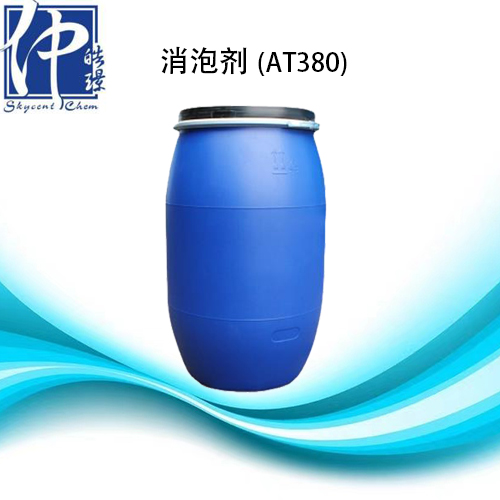 产品简介Skytech ® AT380 是一种多组分复配类消泡剂,在水中分散极易,使用方便。在很 宽的温度范围内及剪切力存在下具有优良的消泡效力和抑泡功能等特点,特别适 用于对相容性、不影响透明体系外观等较高的场合。广泛应用于洗衣液内添加、 金 属切削液、纺织印染、工业清洗及其他工业等水性体系中。产品特性1.加入透明体系中不影响体系外观;2.不析出,不漂浮;3.良好的消抑泡平衡性和耐剪切性能;4.固含量高、添加量少;5.水溶性好、可稀释后用;6.无副作用、无刺激性气味;7.原料化学惰性、健康环保;物理特性外 观 : 微黄半透明流动体离 子 性 : 非离子粘度(25℃) : 500~2000mPa·s固 含 量 : ≥82%pH值 : 6.0~8.0使用方法Skytech ® AT380 适用于洗衣液、工业清洗、纺织印染精炼剂、金属切削液、 皂洗剂及其他工业等水性体系中:1、具体用量取决于配方类型或根据消抑泡性能和产品体系外观透明度要求 确认添加量;2、直接加入到起泡体系, 保证其均匀分散。3、根据不同起泡体系的起泡介质、温度及搅拌等因素,以 100ppm 为单位, 选择较为经济的用量,建议:500~800ppm 的用量可达到理想的消泡效果。应用注意事项1、Skytech ® AT380 考虑到可能出现的相容性方面问题,与其他助剂混合 使用时,应事先做相容性试验。 2、避免将产品本身、稀释液或复配液长期直接暴露在空气中。操作及贮存产品在常温条件下一般可贮存 6 个月,应避免将产品长期暴露在极端冷、热的 环境中,极端冷、热的环境可能导致乳液分层、漂油。如果产品出现分层现象, 使用前需适当搅拌使其均匀并过滤;若产品出现冰冻,需将产品置于室温下缓慢 解冻并适当搅拌,切记不可将产品直接加热解冻。为了确保产品质量,容器开封 后应尽快用完,不用时须将容器盖盖紧。